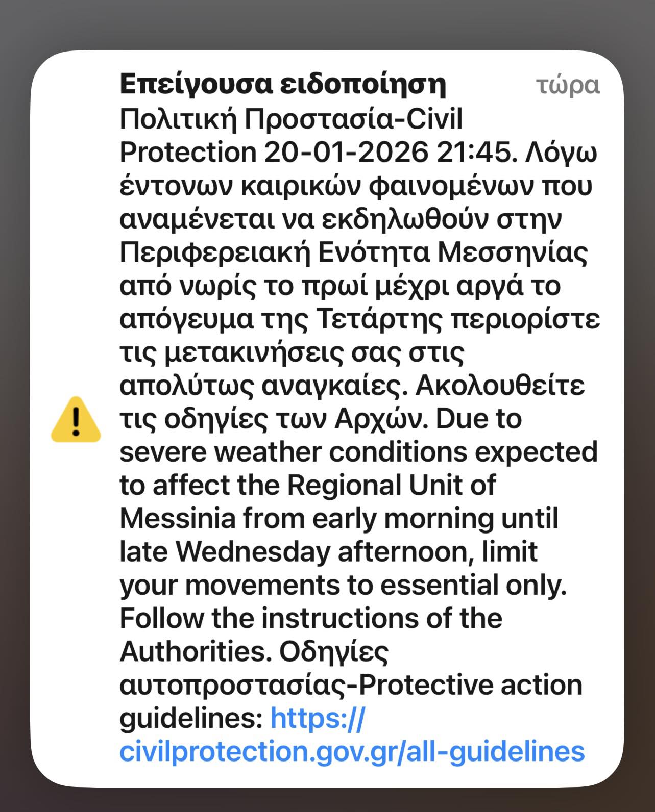 Το περιεχόμενο των μηνυμάτων είναι σαφές και κατηγορηματικό: «Λόγω έντονων καιρικών φαινομένων που αναμένεται να εκδηλωθούν στις Περιφερειακές Ενότητες Μεσσηνίας, Αργολίδας, Λακωνίας, Αρκαδίας και της Κορινθίας από νωρίς το πρωί μέχρι αργά το απόγευμα της Τετάρτης περιορίστε τις μετακινήσεις σας στις απολύτως αναγκαίες. Ακολουθείτε τις οδηγίες των Αρχών».