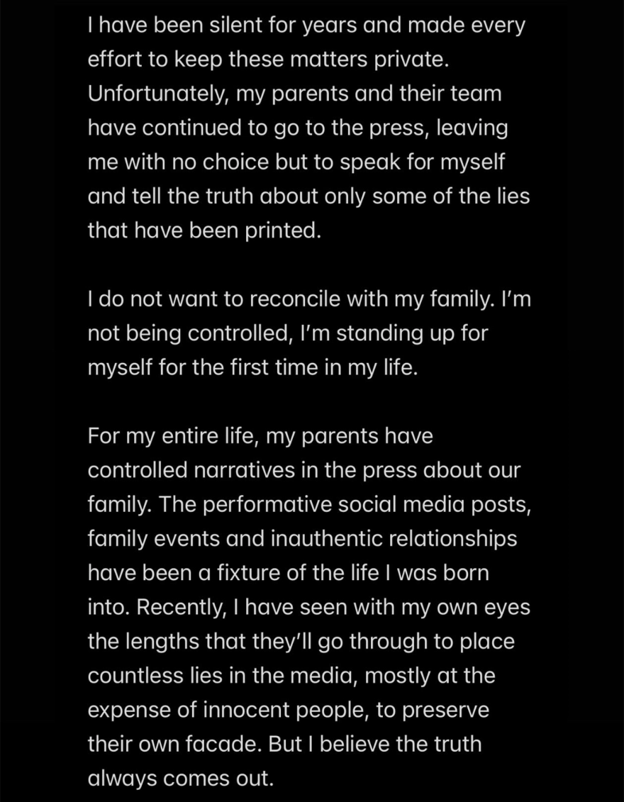 Σε μια εκτεταμένη δημόσια δήλωση, ο 24χρονος κατηγορεί τους γονείς του για συστηματική προσπάθεια υπονόμευσης του γάμου του με τη Νίκολα Πελτζ. Συγκεκριμένα, αναφέρει πως: